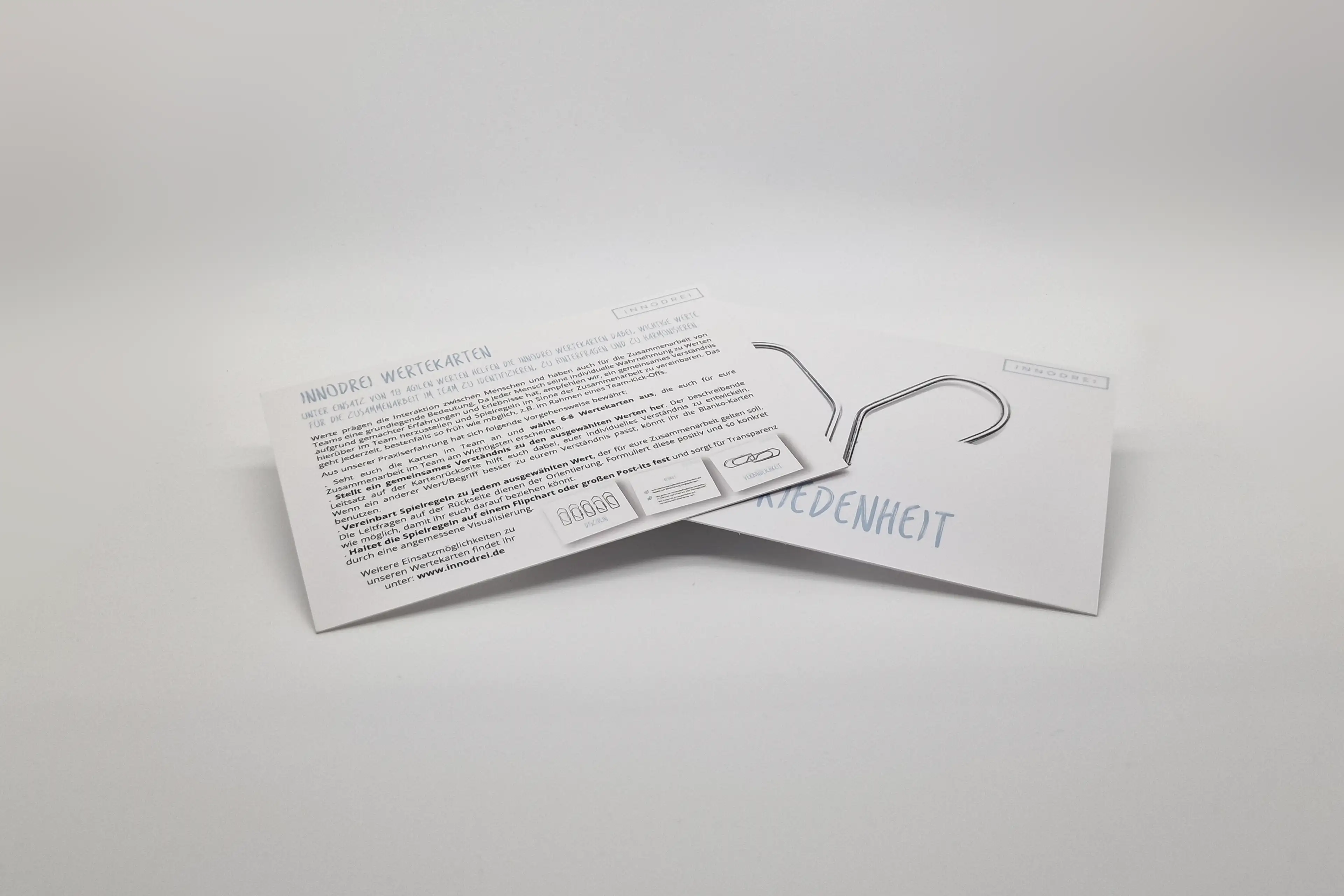 Unter Einsatz von 18 agilen Werten helfen die Innodrei Wertekarten dabei, wichtige Werte für die Zusammenarbeit im Team zu identifizieren, zu hinterfragen und harmonisieren.